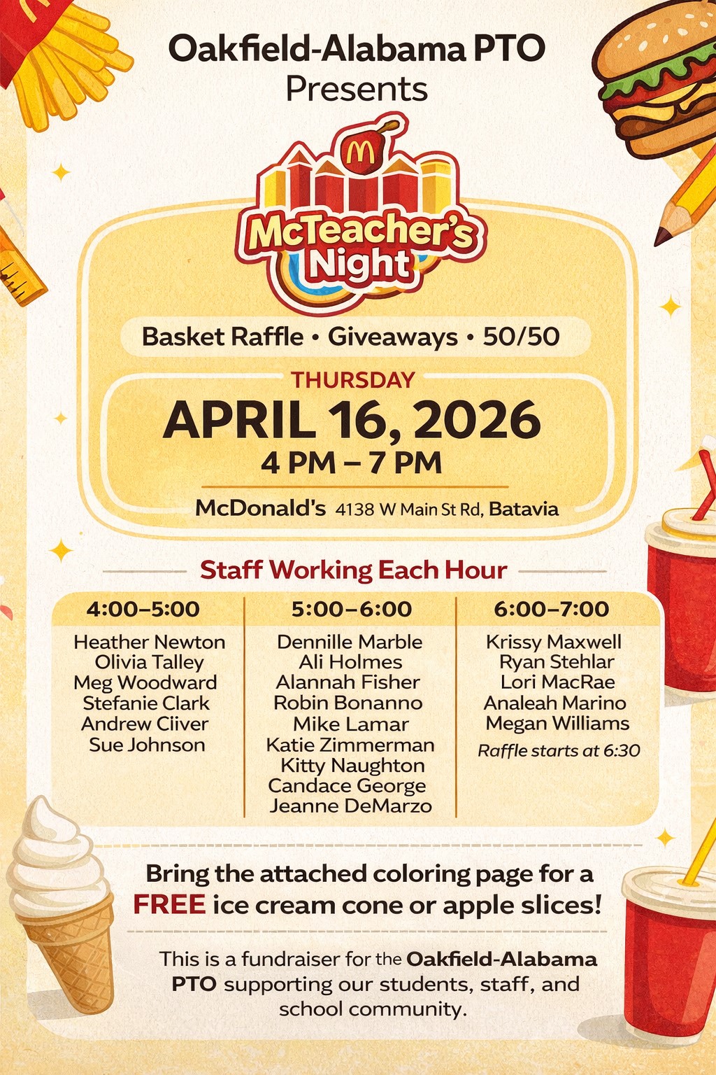 OA PTO PRESENTS - McTEACHER'S NIGHT - THURSDAY APRIL 16TH - 4PM-7PM