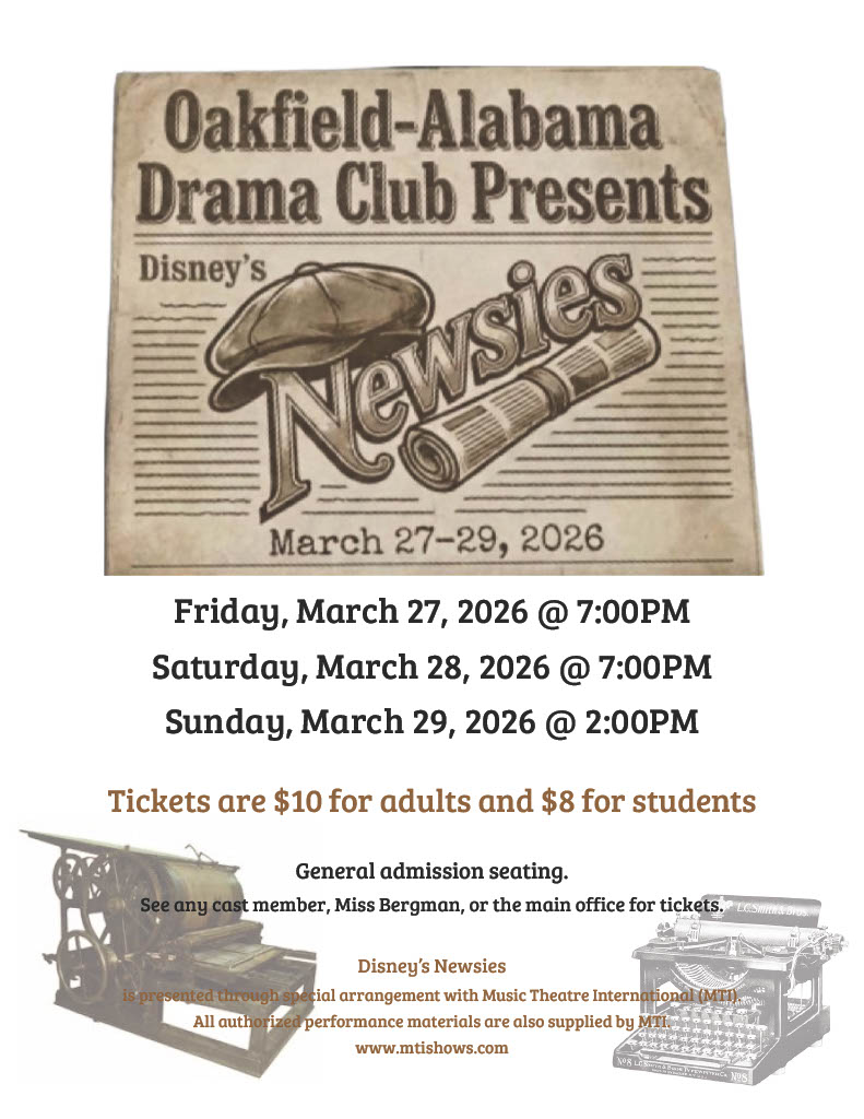 Oakfield-Alabama's musical is THIS weekend - March 27th-29th.Come out to see Newsies!Tickets are $10 for adults and $8 for students. General admission seating. Please see any cast member or contact...