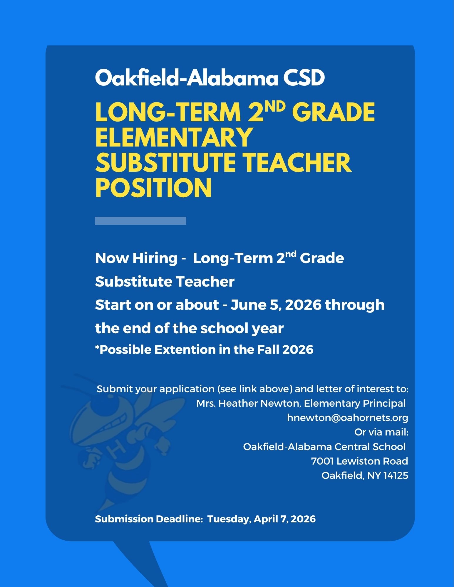 JOB POSTING - LONG TERM SUBSTITUTE TEACHER - 2ND GRADE