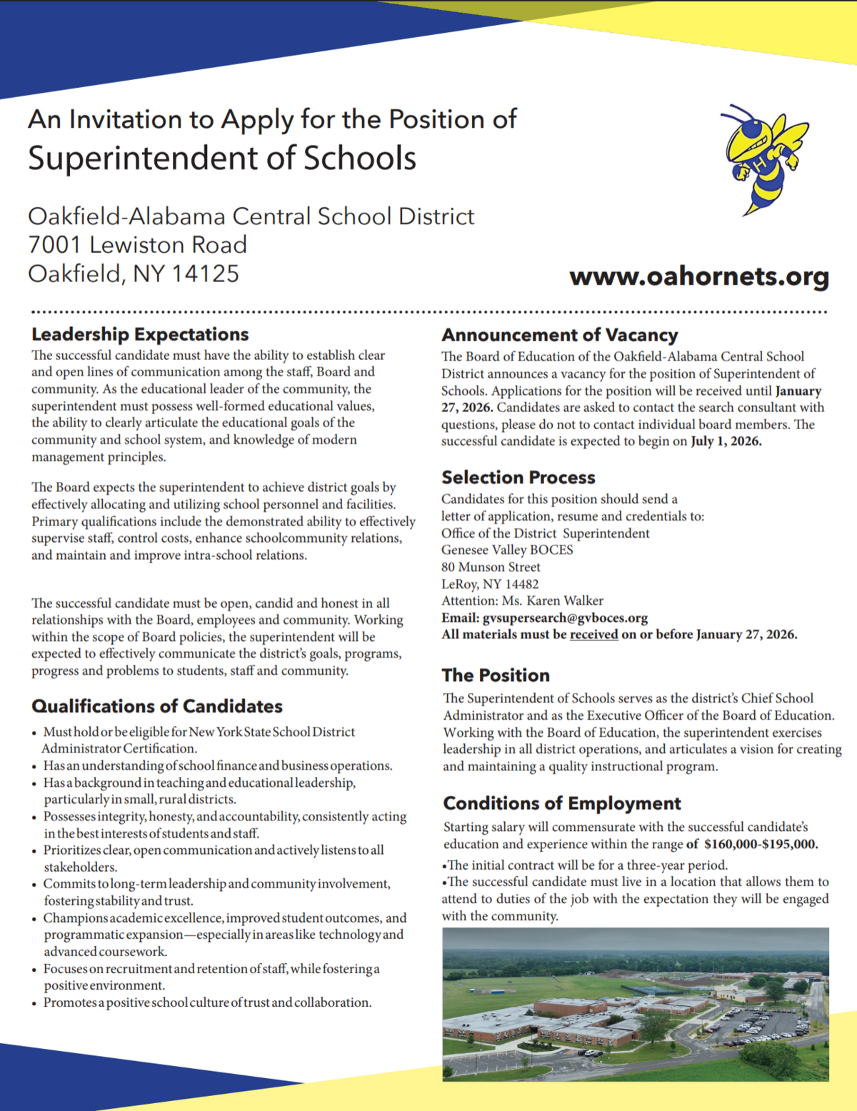 At Oakfield-Alabama Central School District, housing grades 6–8 in a dedicated wing of the building represents an important step toward establishing a true middle school model—one that supports students through the critical transition from elementary to high school. As students move through the Middle High School and into the upper grades, the focus shifts to preparing them for post-secondary education, military service, or future careers. In addition to fulfilling graduation requirements, students can explore a range of electives that align with their interests and goals, working closely with parents and counselors to plan their path forward. Beyond academics, OACS offers a variety of athletic, extracurricular, and academic programs that help students build social, vocational, and cultural skills, shaping well-rounded individuals prepared for life beyond our doors.